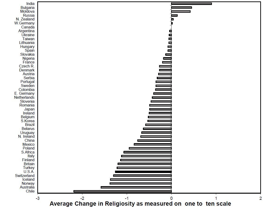 دکتر جانگ توضیح میدهد که امروزه رویکردهای جامعهشناختی مختلفی نسبت به سکولاریزاسیون وجود دارد. یک رویکرد این است که به نوعی نظریه را بازتعریف کنیم. به عنوان مثال رویکرد استیو بروس[10] این است؛ او ادعا میکند اگر این نظریه را دوباره چارچوببندی کنیم، مشاهده میکنیم که با حقایق مطابقت دارد و شاید حتی پیشبینیهای جالبی برای آینده ارائه کند. از نظر جانگ این رویکرد، چندان جالب نیست. برای او رویکرد افرادی مانند پیپا نوریس[11] و رونالد انگلهارت[12] جالبتر است، که عبارت است از جمعآوری دادههای بیشتر و یا بررسی دادههای قدیمی با نگاهی جدید. انگلهارت یکی از بنیانگذاران پیمایش ارزشهای جهانی[13] است که اکنون چند دهه از تأسیسش میگذرد. نوریس و انگلهارت نه تنها به تغییرات در طول زمان و بهویژه در سراسر جهان علاقمندند، بلکه به اینکه چگونه متغیرهای مختلف اجتماعی، سیاسی و اقتصادی تغییرات در ارزشها و باورها را پیشبینی میکنند نیز علاقه دارند. نموداری که در ادامه مشاهده میکنید، دادههای پرسش از اهمیت خدا در پیمایش ارزشهای جهانی را نمایش میدهد.