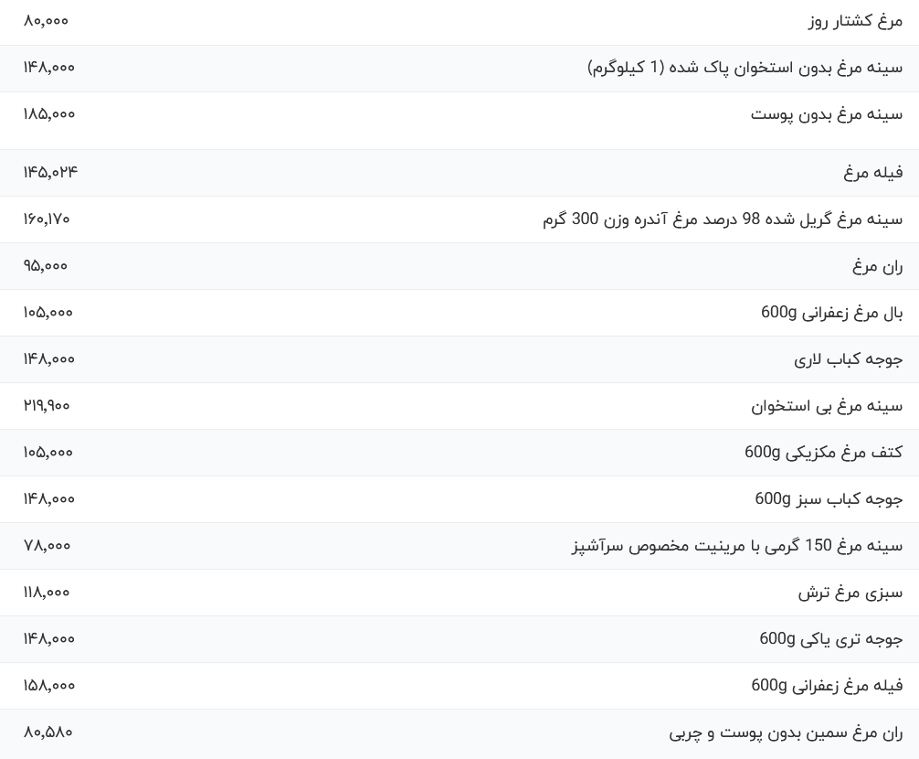سرویس اقتصاد «انتخاب»: قیمت گوشت مرغ، امروز ۱۹ اسفند ۱۴۰۳ شامل ران مرغ، مرغ زنده، مرغ بدون استخوان، فیله مرغ، پا مرغ، مرغ کشتار روز، ران مرغ با پوست، مرغ ترش و مرغ سبز اعلام شد.