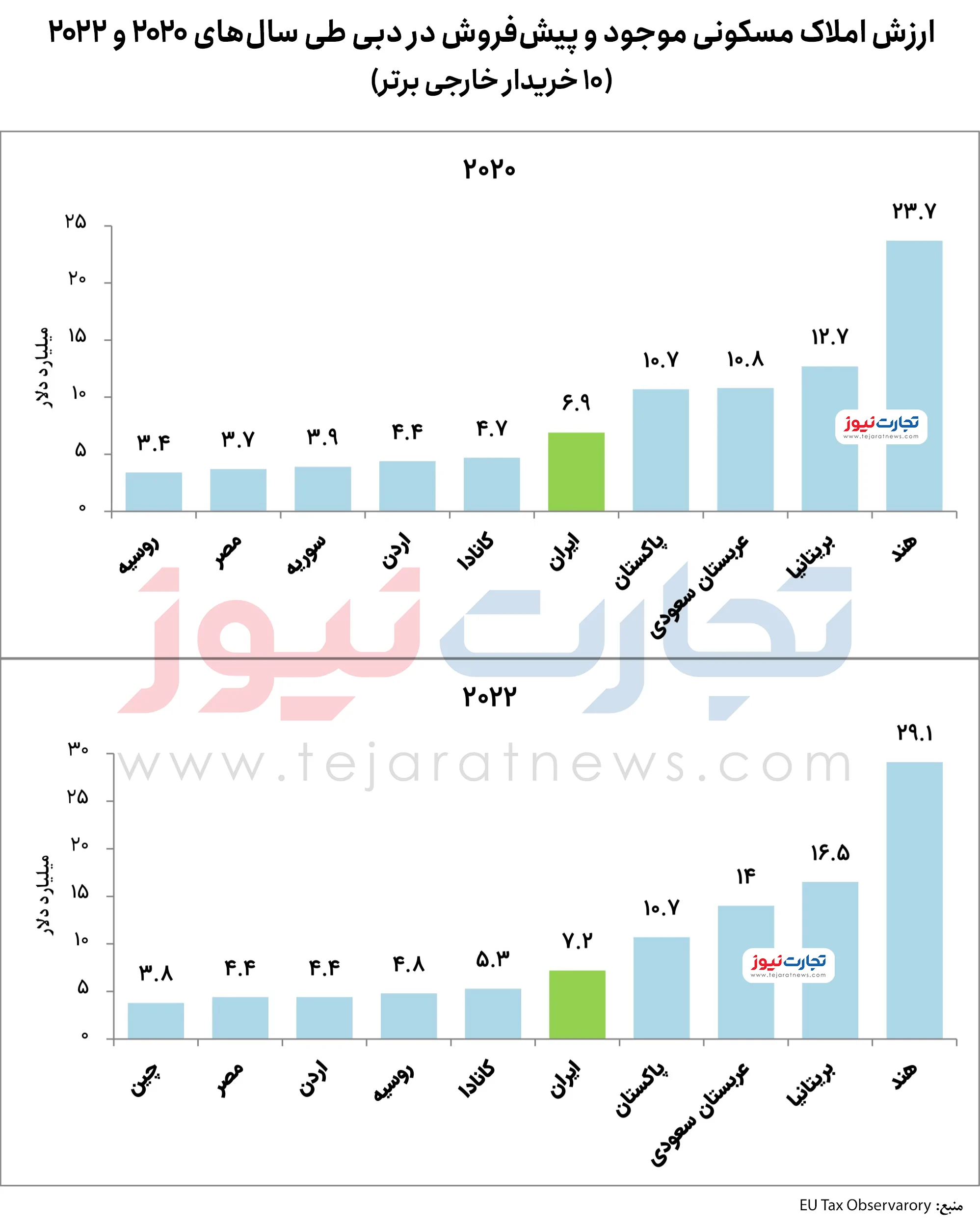 بررسی گزارش  EU Tax Observatory نشان می‌دهد که حدود ۴۳ درصد از ارزش کل املاک مسکونی شهر دبی در اختیار اتباع خارجی است؛ همچنین ارزش املاک مسکونی متعلق به خارجی‌ها در بازه زمانی ابتدای سال ۲۰۲۰ تا اوایل ۲۰۲۲ حدود ۲۰ درصد افزایش یافته که معادل ۲۳ میلیارد دلار است.