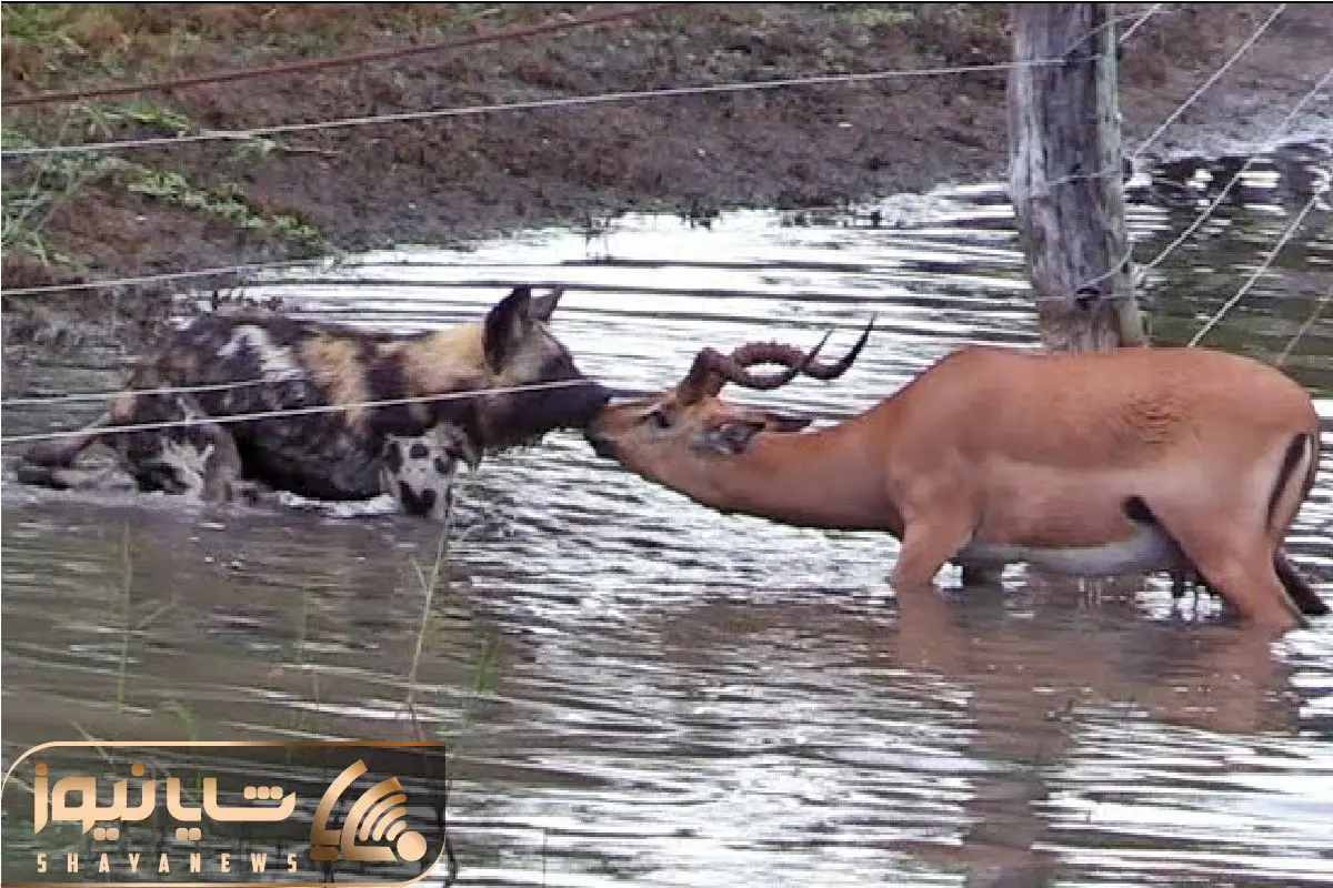 در این ویدیو ببیند که چگونه سگ های وحشی یک ایمپالا را در آب شکار میکنند.